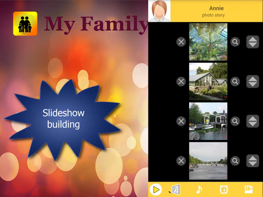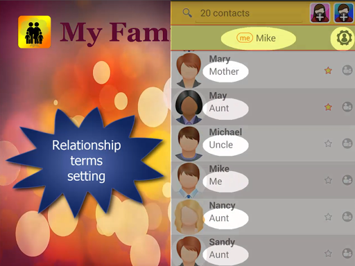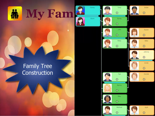 My Family app constructs family tree for contacts, sets relationship terms of family members with reference to any selected individual and builds slideshow and local timeline for each individual. Data files of the app in a device can be easily shared remotely with others in a secured way.