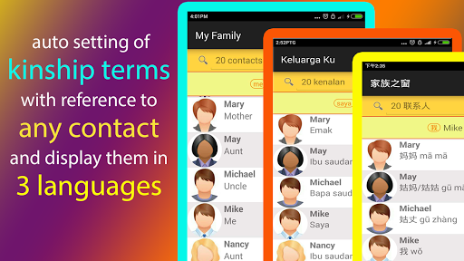 Relationship terms can be set in English, Chinese or Bahasa Malaysia.