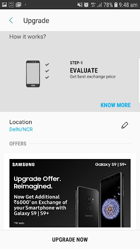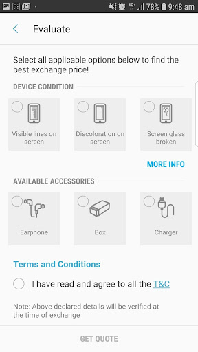 1. Download My Galaxy app & evaluate the exchange price of your old device by giving inputs about age of your device, screen condition, available accessories etc.