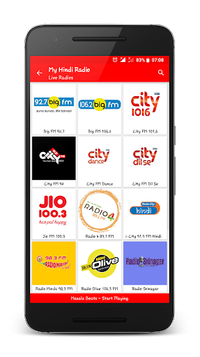 90.8 FM Aap Ki Aawaz, Ever Green Bollywood Radio, Fever FM, Hindi Retro Bollywood Radio, Hot Now Bollywood Radio, Non Stop Hindi Radio, Radio 4 89.1 FM, Radio 88 Hindi FM, Radio City Bollywood Mix, Radio City Hip Hop, Radio Fiji Two, Radio City Ishq, Abee Radio, Akaash FM, AMA Radio, Ambur Radio 103.6 FM, Apna 990 AM, Apna eRadio, AR Rahman Hindi, Arijit Singh Radio, Artist Aloud, Asha Bhosle Radio, Asian Radio, Asian Star 101.6 FM, Australian Indian Radio, B & W Classics, BBC Asian Network, Big FM 106.2, Bindas Radio, Bolly 102.9 FM, Bolly 92.3 FM, Bolly Beatz, Bolly Hits Radio, Bollywood Hits, Bollywood Instrumentals Radio, Bollywood and Beyond, Bollywood Bio Music, Bollywood Muziq Zone, Bollywood Radio Germany, Bollywood Trax, Bombay Beats, Brisvaani Radio 1701 AM, Calm Radio, City FM 101.6, City FM 92, City FM Dance, City FM Dil Se, Club Mirchi, CMR 101.3 FM, CMR HD Radio, Desi Bollywood, Desi Junction Radio, Desi Maska Radio, Desi Music Mix, Desi Networks Radio, Desi Radio 1602 AM, Desi World Radio, Desi Zone Radio, Dhol Radio Punjabi, Diverse FM, Easy 96 Radio, EBC Radio 1170 AM, Fever 104 FM, Filmy Mirchi, Fun Asia Radio, Hid Radio, Himal Radio, Hum FM, Best of Indie Pop Bollywood Radio, Bollywood Dil Se Radio, Best of Ghazals, Dance Masti Bollywood Radio, India Beat Radio, Indifun Radio, Intamixx Radio, Jazbaa FM, Jio FM 100.3, Kishore Kumar Radio, Lata Mangeshkar Radio, Lata Rafi Radio, Lyca Dilse 1035 AM, Lyca Radio 1458 AM, M4U Radio, Masala Beats, Mast Radio, Meethi Mirchi, Megazone Bollywood, Mirchi 90's Bollywood, Mirchi Top 20, Mohammed Rafi Radio, Mukesh Radio, Music Live FM, MY Masti Chat, Namaste London Radio, Nuke Hindi, Nuke Hindi Old Hits, Oye India FM, Pro Plus Radio, Puneri Awaz 107.8 FM, Radio RC Caprice FM, Radio 360, Radio 90.5 FM, Radio Afsana, Radio Azad, Radio Central, Radio Central 24, Radio Chann Pardesi, Radio City Freedom, Radio City Fun Ka Antenna, Radio City Ghazal, Radio City Hindi, Radio City IndiPop, Radio City Love Guru, Radio Dabang 105.3 FM, Radio Dehotties, Radio Dhishum, Radio Dil, Radio Garam Masala, Radio Hindi International, Radio HSL, Radio Humsafar, Radio India 1600 AM, Radio Khushi 90.4 FM, Radio Mehfil, Radio Mirchi 98.3 FM, Radio Namkin, Radio Navtarang, Radio Noida 107.4 FM, Radio Olive 106.3 FM, Radio Pehchaan, Radio Rasonic, Radio Rhythm 1053 AM, Radio Rishtey, Radio Sangam, Radio SBS FM, Radio Taj, Radio Udaan, Radio XL, Radio Zindagi, RD Burman Radio, Red FM 106.7, Retro Bollywood, Sada Bahar Music Radio, Salaam Namaste 1480 AM, Sangeet 106.1 FM, Sayaji FM, SBS Pop Desi FM, Sitara FM, Sound Asia FM, Spice FM 98.8 FM, Suno 1024 FM, Sunrise Radio, Suvidha Radio, Taal Radio, Top FM, Udit Narayan Radio, Ujala Radio, Unity 101, Vahon Hindustani Radio, VDesi Hindi, Vybez Station, WWRL 1600 AM Hindi, AIR Indore, FM Rainbow Delhi, Vividh Bharati, 60s forever, Aakashvani 106.5 FM, Yaar Radio, AIR FM Gold Delhi, 90S Once Again Bollywood Radio, Radio Jaagriti, Radio Umang, Tarana Radio, 2B Radio Love, 2B Radio Retro, Radio Faza FM