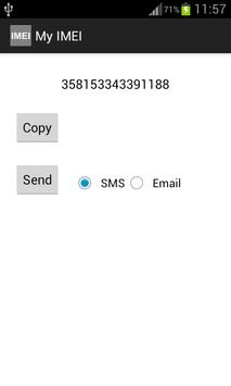 This application will show you your device IMEI and also will give you option to copy it to clipboard or send it via SMS or Email. Keywords : IMEI, IMEI code,IMEI Checker, Show IMEI, Get me IMEI, Unlock IMEI