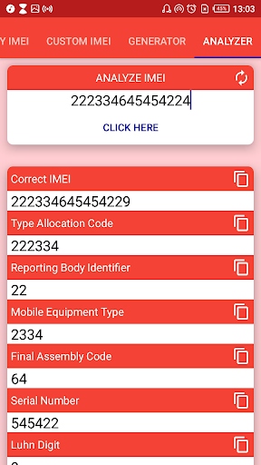 This app is an IMEI generator, an IMEI analyzer and an IMEI checker all in one place and in one package.
