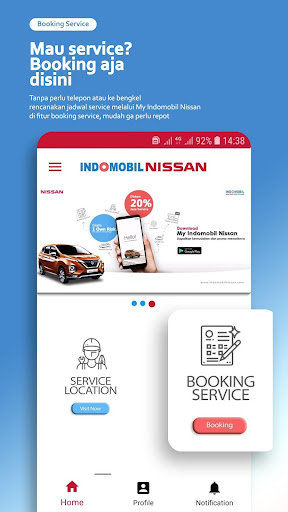 2. Dịch vụ đặt phòng, trong menu này, bạn có thể đặt dịch vụ với nhiều lựa chọn khác nhau, Trung tâm dịch vụ Nissan, Dịch vụ di động Nissan và Sửa chữa cơ thể. Đủ bằng cách đăng nhập vào Indomobil Nissan của tôi và hoàn thành dữ liệu xe của bạn. Bạn có thể sử dụng tính năng này mà không cần phải gọi hoặc đến xưởng. Bạn cũng có thể tìm ra tình trạng theo dõi của các phương tiện được phục vụ.