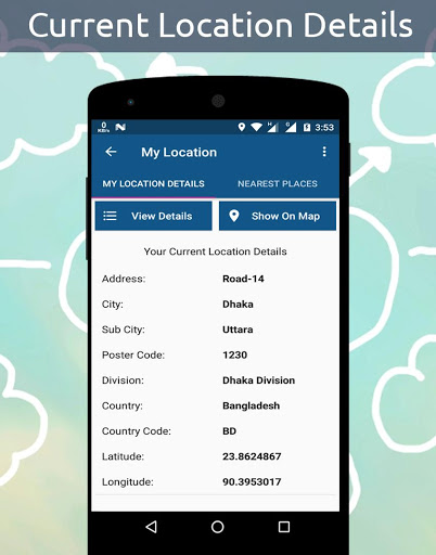 This is a fully free mobile application for android platform. By using this application user will able to know the full details of his/her current location. In full details there will be Address, City Name, Sub-City Name, Poster Code, Division Name, Country Name, Country Code, Latitude and Longitude.