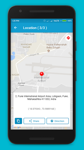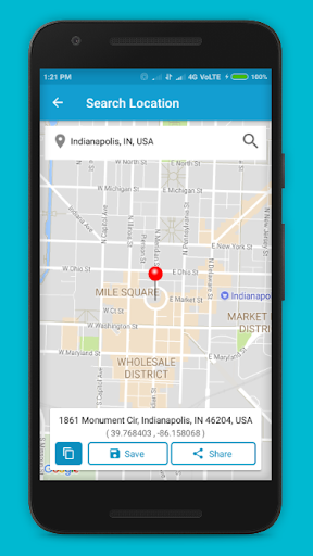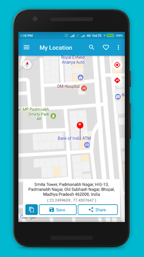 Find and save any place on the map with complete address.You can easily share your current location data via your preferred messaging app. It will share your current location address and a link to Google Maps with your position on it.