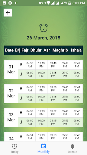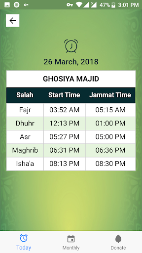 A Free application that will provide the latest Namaz/Salah times for your nearest Masjid. A list of your Masjid's timings on your mobile device, giving you access to the latest Namaz/Salah times and alerts.