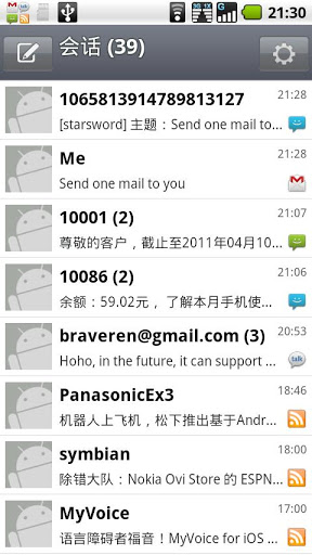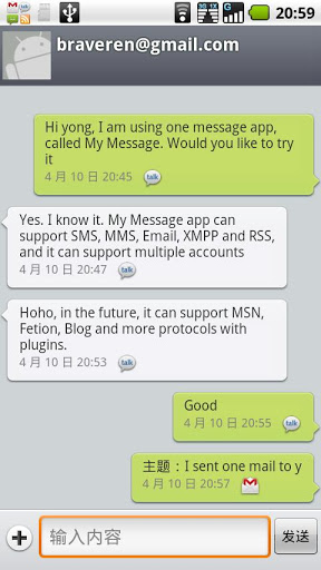 My Message is an enhanced message app. It give you an unified message sending experience. Fast and smaller size than other message appsFeaturesSupport SMSMMSWAP push Support XT800 Dual mode phoneSupport email support IMAP, POP, SMTP protcolsSupport GtalkXMPP text messageSupport Rss newsSupport FetionMultiple attachmentsPDFWordExcelPPTThread view mode and Inbox, Sent, Outbox modeAdd more accounts Email, XMPP, RSSSupport theme switch and download backup message data and restoreApk size is very small,only about 400KKeywords: SMSMMSEmailIMRSSGtalkXMPPMSNFetionQQBackupFetionThemeHelpful:1. If you meet MMS retrieved issue, Modify account quot;My Phonequot;, input correct MMSC address and Proxy2. To use feature quot;Importquot;, you must backup your message once at least.