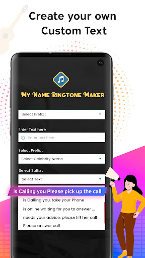 Make special and beautiful ringtones with given text or you may choose from default text. This app helps to make your favorite name as part of your caller tones, when call comes then your name caller tone will speak and play. You may edit the existing mp3 tones by trimming the tones and can set as ringtone.