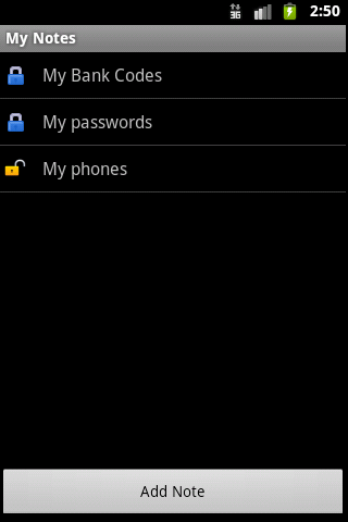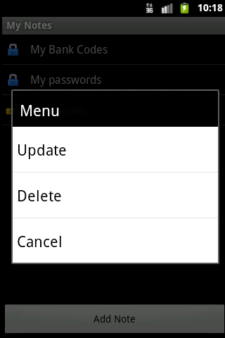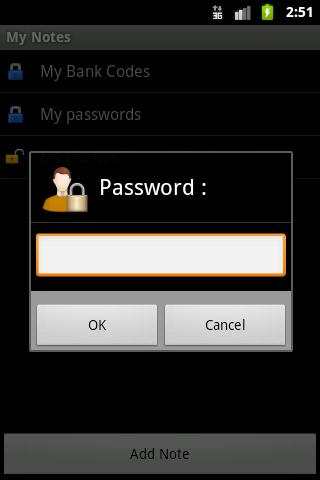 It39;A an application that allows users ti save thiere notes and secure them using password.You can at any time add, update or delete a notes.You can also export your notes to a text file.quot;To Edit a saved note long touch on the note and a menu will be displayedquot;