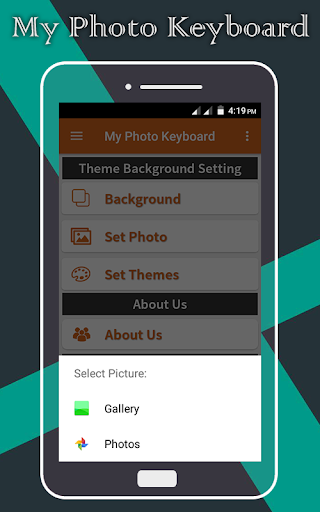 - Set Photo From Gallery and Camera on keyboard,Set Different Types Of Themes for keyboard.