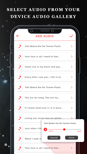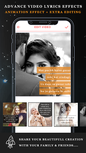Create and share lovely Lyrical Music video within a minute with your personalized. create your own music video with your personalized photos and texts. just pick your images and select best lyrics and you are done with awesome video. You can share it on your Facebook, Instagram, Whatsapp story.