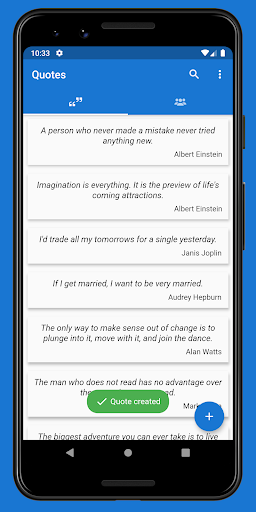 My Quotes is a simple and intuitive app that lets you store your favourite quotes in one place. It is designed to easily manage all your quotes as well as their's authors. It also lets you search through quotes and authors contents.