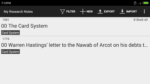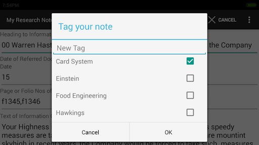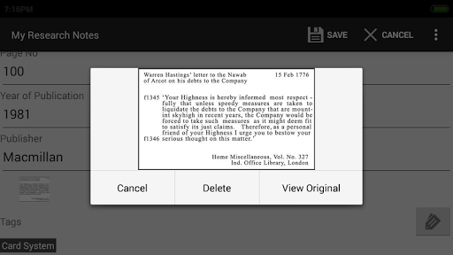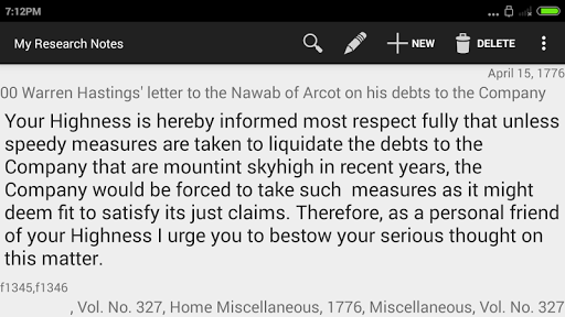 The mobile app MyResearchNotes greatly enhances the productivity of the researcher. It helps to organize material in a scientific way.The mobile app will work even when there is no phone (Network) connectivity as in case of remote excavation locations or basement archives, making it an invaluable tool in streamlining the preliminary operations for undertaking research.