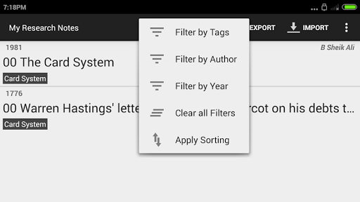 List of notes comes up at beginning. The title of the note is followed by sorting tags defined by the user. Tapping on the tags will sort the list according to the tag selected. The filtering and sorting options are available to filter by tags given by the user, or by the author of the source document, or by the year of publication.