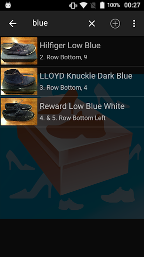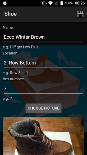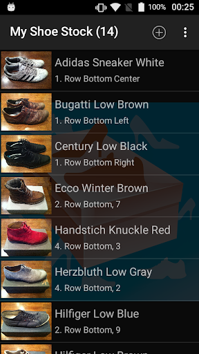 Enter each of your shoe with the manufacturer, the type, color, size, location, a photo, and the number of the shoe box or whatever else is important to you and you will find your shoes easier, clearer and quicker in your shoe stock.