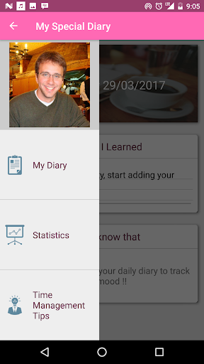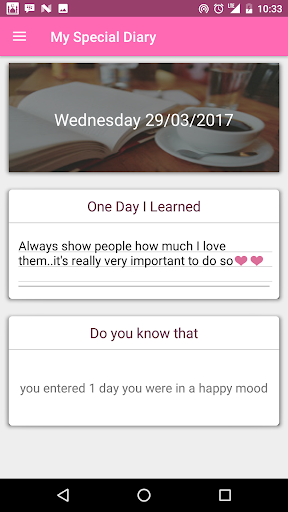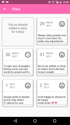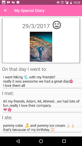 This app helps you to fill your diary by asking you questions about your day and saving the photo the day, It has a daily notification to remind you to add to your diary.