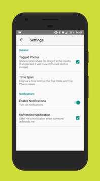 With the last update this app provides you with an UNFRIEND TRACKER that makes it possible for you to know whether someone unfriended you on Facebook. Get a notification as soon as the app detects your friends count changed. This way you will be able to automatically keep track of your friends count. Be aware that this app will not tell you who unfriended you, since this is not permitted by Facebook privacy policy. This tool is just meant for you to keep track of your total friends count, that can decrease when someone unfriends or blocks you.