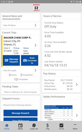 Dispatch information, hours of service, trip pay, safety data, and company news are only some of the many great mobile app features.