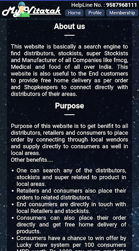This website is basically a search engine to find distributors, stockists, super Stockists and Manufacturer of all Companies like fmcg, Medical and food of all over India. This website is also useful to the End customers to provide free home delivery as per order and Shopkeepers to connect directly with distributors of their areas.