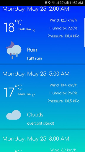 ○ Five Day/3 Hour forecast: Can fetch forecast data for any city world-wide with time being displayed in the correct timezone. The forecast will give weather data for every three hours for up to five days with all the detailed information provided in the current-weather.