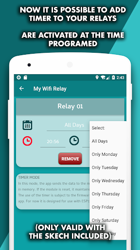 Now it is possible to add independent timers to your relays. Set the day, the activation and deactivation time and your relay will activate at the scheduled time.