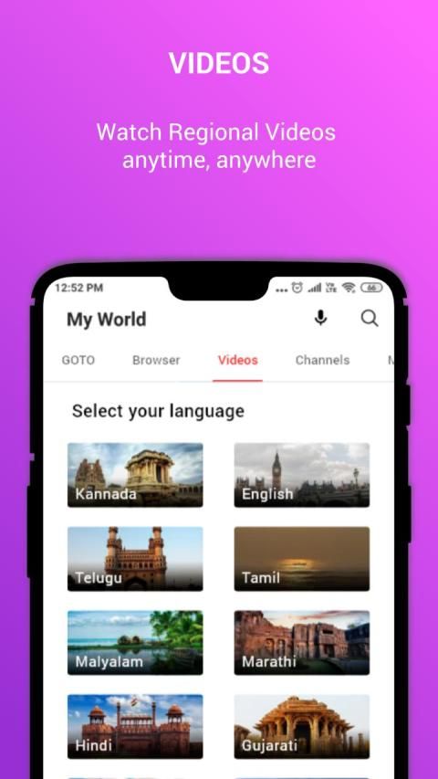 * Videos Section offers popular videos and channels from 14 different Indian languages. Just sit, relax and watch the latest trending videos updated regularly. It offers videos from various categories like Travel, Cooking, Fitness, Bollywood, Kids etc. Supported languages in Videos are English, Hindi, Telugu, Tamil, Malayalam, Kannada, Gujarati, Marathi, Bengali Urdu, Assamese, Odia, Punjabi, Nepali etc.