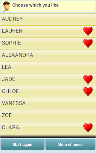 Do you have the same preferences? we propose a list of pairs of names chosen at random. Names are shown in pairs, and each time, you must select one of them. Dad will choose their favourites and Mum will do the same. How many names will match?