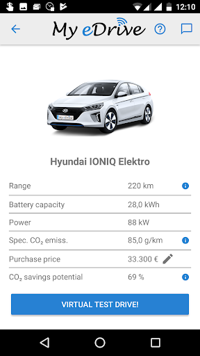 My eDrive allows you to "virtually test drive" any electric vehicle on your smartphone to see if it really fits your needs. My eDrive calculates for your personal usage pattern not only the range, but also the CO