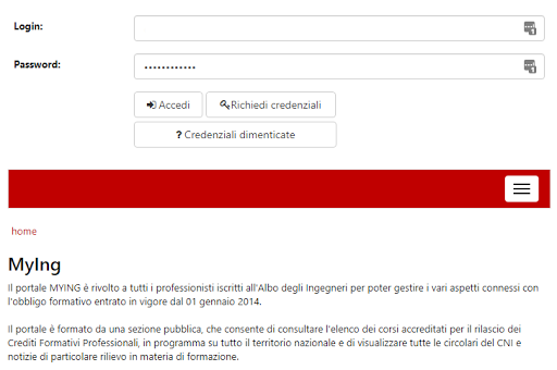 Applicazione Portale MyING - Formazione continua CNI Ordine degli ingegneri: Il portale MYING è rivolto a tutti i professionisti iscritti all'Albo degli Ingegneri per poter gestire i vari aspetti connessi con l'obbligo formativo entrato in vigore dal 01 gennaio 2014.