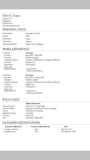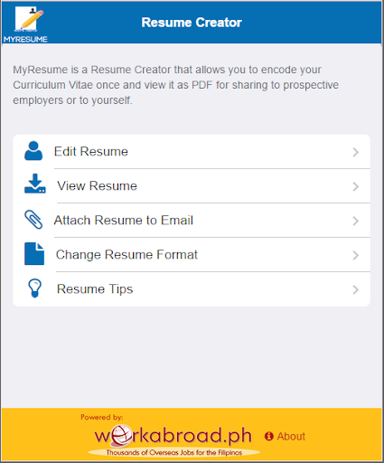 MyResume is a Resume Creator that allows you to encode your Curriculum Vitae once and view it as PDF for sharing to prospective employers or to yourself.