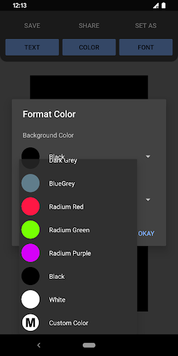 Just enter your text, then select the font color, background color, font style and set the wallpaper!