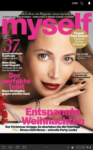 One click on the myself DE ePaper application opens a world of intelligent entertainment and relaxation. It is there for you at all times wherever you are. You find first-rate exclusive articles on fashion, beauty, travel, and food as well as life style segments, aside from well-researched excellent articles on health, psychology, culture, lifestyles and jobs. The myself DE ePaper application includes the entire content of the print edition with all topics of interest for modern self-assured women.