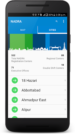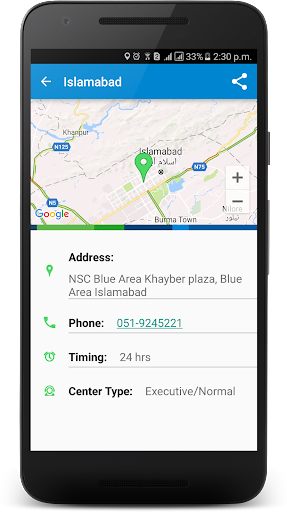 · Locates the nearest NADRA’s office/center and displays its complete details including address, operating hours, center type(ordinary/executive);