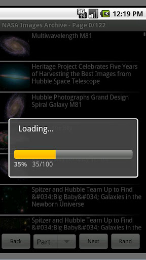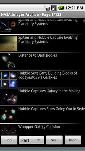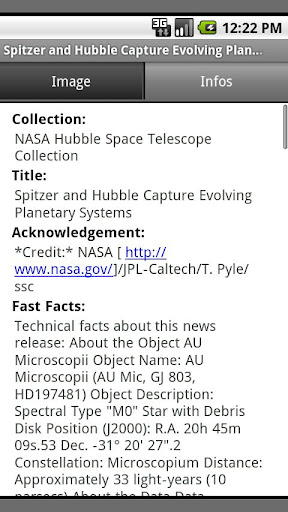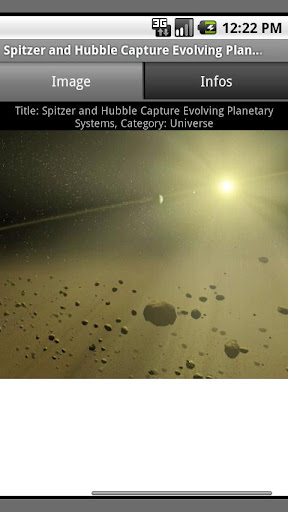 The bigest NASA images arhive on Android market! More than 60 000 images with...\nThe bigest NASA images archive on Android market! More than 60 000 images with full information title, description, release date, object name, object type, position, distance ... in 5 categories: Universe, Solar system, Earth, Aeronautics, Astronauts.\n- Save image\n- Send image\n- Set as wallpaper\n- App can be installed on sdcard (only for android 2.2 and higher).\n60k image is divided to 122 parts. 4 parts are included in app itself. The rest you have to download one by one in need.\nkw: hubble, star galaxy, nebulae, planet, NASA, space, background, wallpaper, planet, astronomy nDisclaimer: This app only provide the easy way to access to NASA images (nasa.gov), it does not own any image. Sometime loading is slow because of over-load on NASA's image server, so please be patient and try again later.