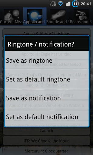 Sounds from the NASA missions to space.The sounds can be saved as ringtones or notifications for text sms, whatsapp, google chat Google talk and others by quot;long pressingquot; a sound. Or you can just play sounds within the app.All sounds are from tha NASA website I just made it easier for you to use.Disclaimer: Developer of this app is not affiliated or endorsed by NASA.