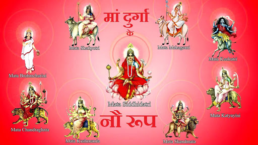 Durga is worshipped in different forms. She is a form of "Shakti". The evolution of Shri Maha Saraswati, Shri Maha Laxmi and Shri Mahakali (the 3 main forms of "Shakti") took place from Shri Brahma, Shri Vishnu and Shri Mahesh respectively. Each of these 3 deities gave rise to 3 more forms and hence in all, these 9 forms together are known as Nav-Durga.