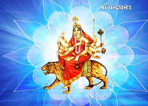 3) Chandraghanta The name of third Shakti is Chandraghanta. There is a half-circular moon in her forehead. She is charmful and bright. She is Golden in color, possesses ten hands and 3 eyes. Eight of her hands display weapons while the remaining two are respectively in the mudras of gestures of boon giving and stopping harm. Chandra Ghanta, meaning supreme bliss and knowledge, showering peace and serenity, like cool breeze in a moonlit night. This Durga Shakti rides a tiger.