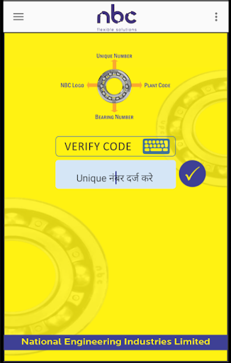 Users can ascertain the genuineness of a NEI bearing using this app. Each NEI bearing has a unique, non-serial, unpredictable, random, 9 digit alphanumeric code laser-marked on the side of the bearing. To authenticate the NEI product,