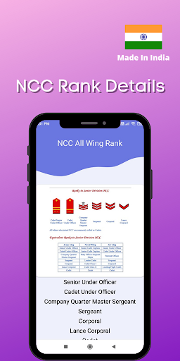 The ncc India app has details about the military and ncc ranks, workout, ncc commands, rifles, NCC song, training, and uniforms used in ncc . ncc India app includes audio for ncc commands and ncc song.