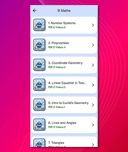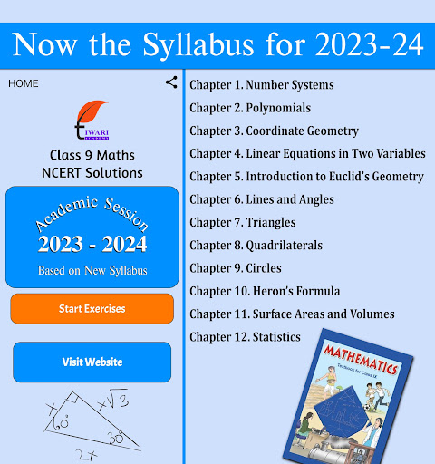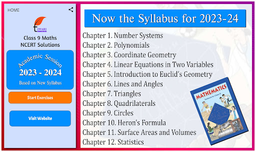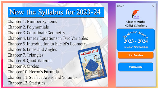 Note: Earlier there were 15 chapters in 9th Maths course but now only 12 are there in curriculum 2023-24. Rest three chapters are removed from NCERT textbook published for new session 2023-2024. This app also contains only that chapters which are in syllabus. Rest deleted from the app. For any inconvenience, please contact us for help.