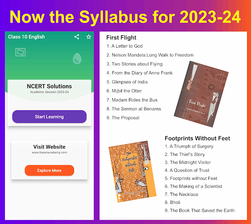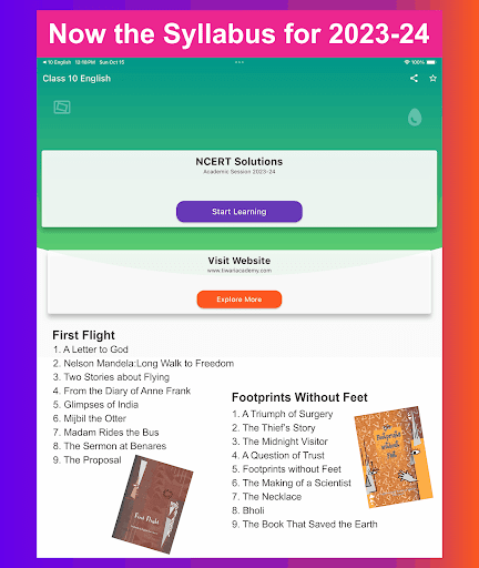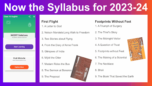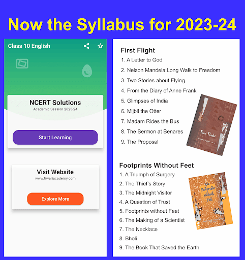 This Class 10 English NCERT Solutions is revised and modified according to rationalised NCERT books published for academic session 2023-24. The 10th English Question Answers App is covering the books First Flight and Footprints without Feet based on current CBSE Syllabus. It contains the following chapters: