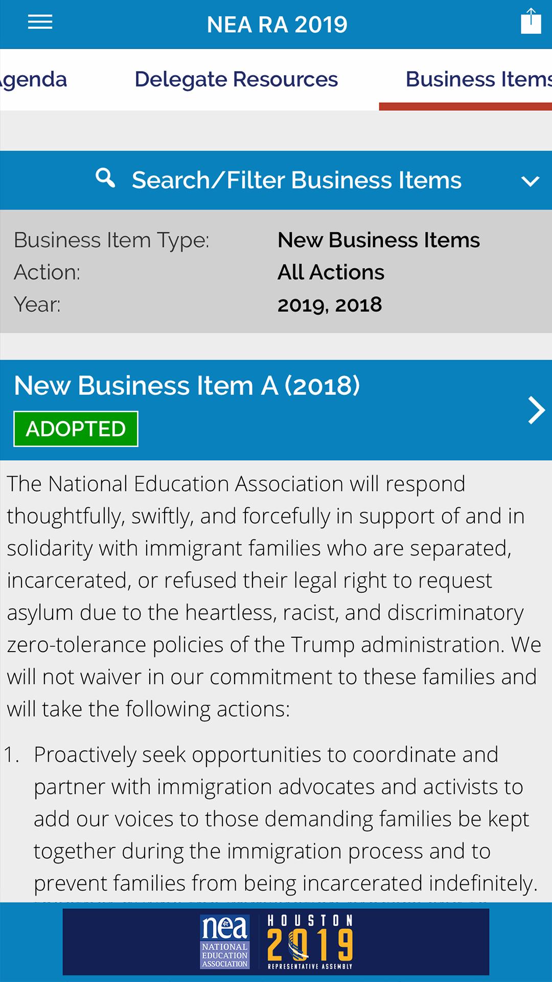 It's the official mobile app for the 2019 NEA Annual Meeting and Representative Assembly in Houston. View the RA agenda, business items, and media updates, get access to myRA features, and more!