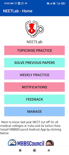NEETLab - MCQ Practice App for NEET 2022-2023 Examination which helps you to track NEET preparation progress and boost your score in NEET examination. It helps to improve your score by providing practice on important questions(MCQ) which are frequently asked in medical entrance examinations such as NEET, AIIMS, JIPMER and state level medical entrance examinations conducted earlier.