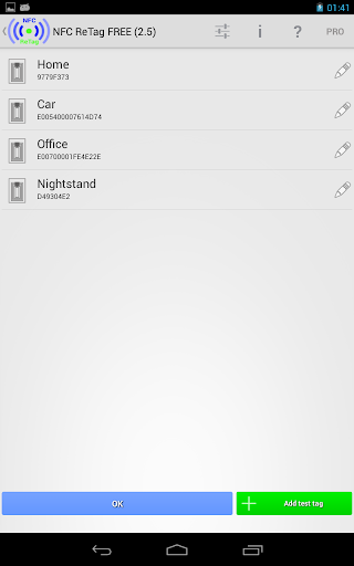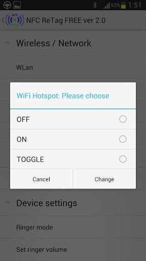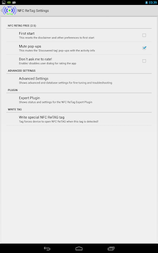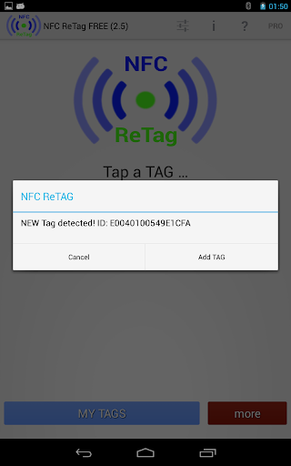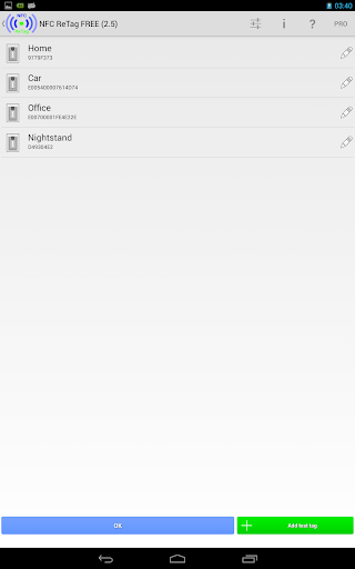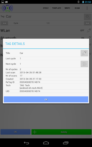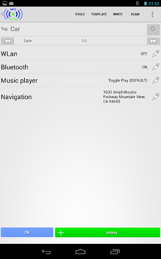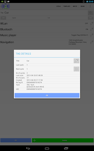 You can use this app to associate multiple functions (e.g. Wlan OFF, Bluetooth ON, Mobile Data TOGGLE, start navigation,run Tasker task, start any installed app, use media buttons, call a phone number, add a timestamp, calendar entry, add Text-to-Speech and much more!) to a NFC (near field communication) tag via an app internal database. You can even add tag cycles and let your tag run different activities per scan. So ReTag is the perfect NFC automation tool for you ;-).