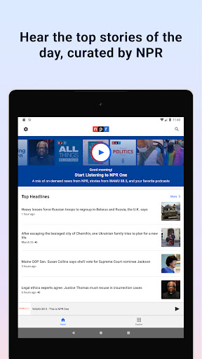 NPR One starts with the latest headlines then moves to a flow of stories that matter - narratives that increase your understanding, create connections, enrich your life and enliven your mind. All thoughtfully curated by hand, every day.