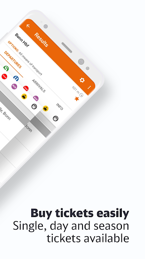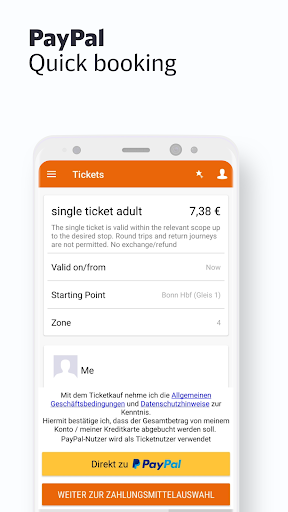 Every type of ticket for the North Rhine-Westphalia transport associations is available in the app: single tickets, multi-journey tickets, day tickets, weekly tickets and monthly tickets. You can pay by credit card (VISA, MasterCard, Amex), direct debit or PayPal. You can also buy tickets for someone else, such as a friend or child.