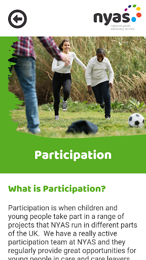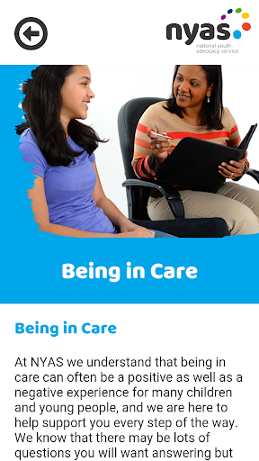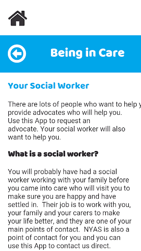 The free NYAS advocacy app gives you direct contact with the NYAS helpline if you need an advocate. It also contains useful information about what your rights are if you are in care (including mental health settings), if you are a care leaver or if there are child protection issues about you. It is a quick reference for professionals too about advocacy and the services NYAS provides.