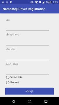 Welcome to Namasteji driver registration application - This application gives you interface to insert driver name,Mobile Number, Vehicle Number,Stand Area Name, Vehicle rent and own details ,own Vehicle name and Mobile number .