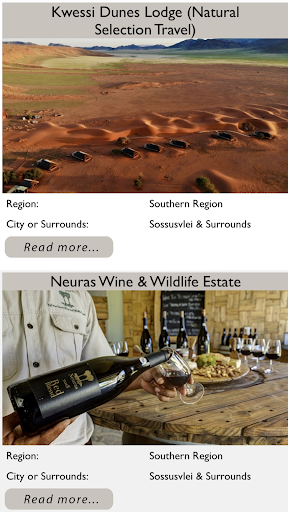 Namibia is your comprehensive travel guide to Namibia, featuring accommodation, activities and adventure, amenities and services, car hire, tour operators, camping and self-catering facilities, conferencing, restaurants, fuel stations and leisure. Each region features extensive information about its places of interest and peculiarities, also showcasing maps, galleries and all accommodation establishments in surrounding towns and tourist areas. Furthermore, the app presents interesting travel tips, links to travel forums and also gives you a take on Namibia’s people, history and demographics.