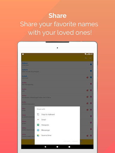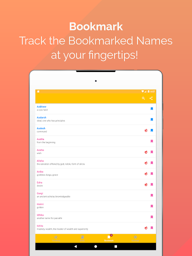 Bookmark: You can add your favorite names by just clicking on the bookmark button next to any name and all the names will be available on your Bookmark list. You can check and track your favorite names at your fingertips. You can share the favorite names with your loved ones through social media and instant messengers.